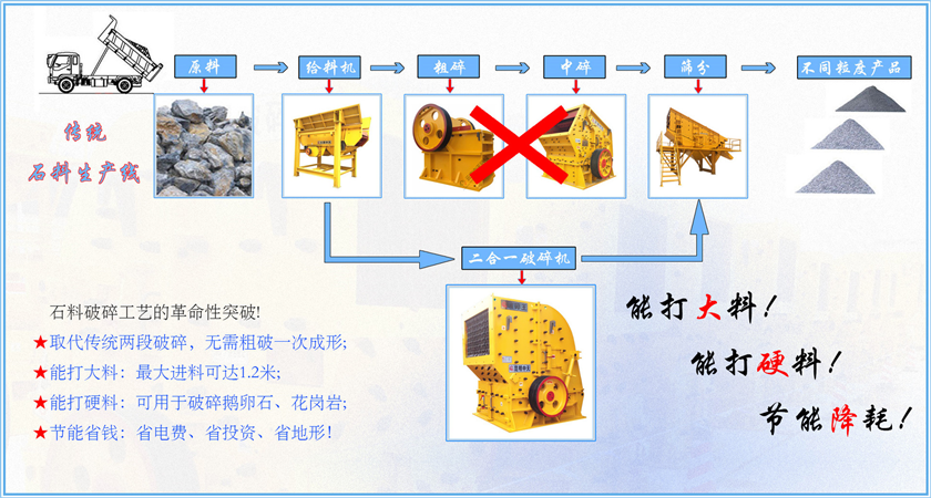 集粗破碎細(xì)破碎為一體,取代傳統(tǒng)的顎式破碎機(jī)及反擊式破碎機(jī),減少流程、減少維修,從而提高生產(chǎn)效率。