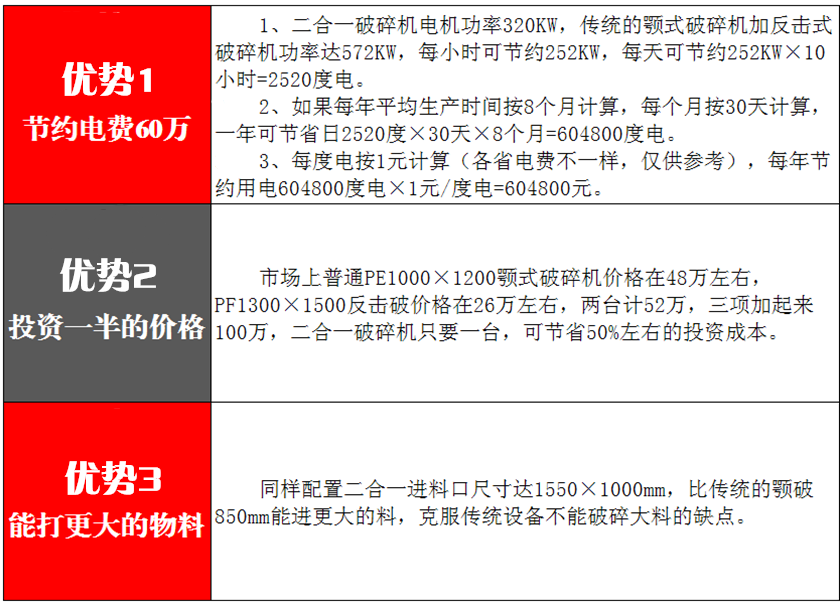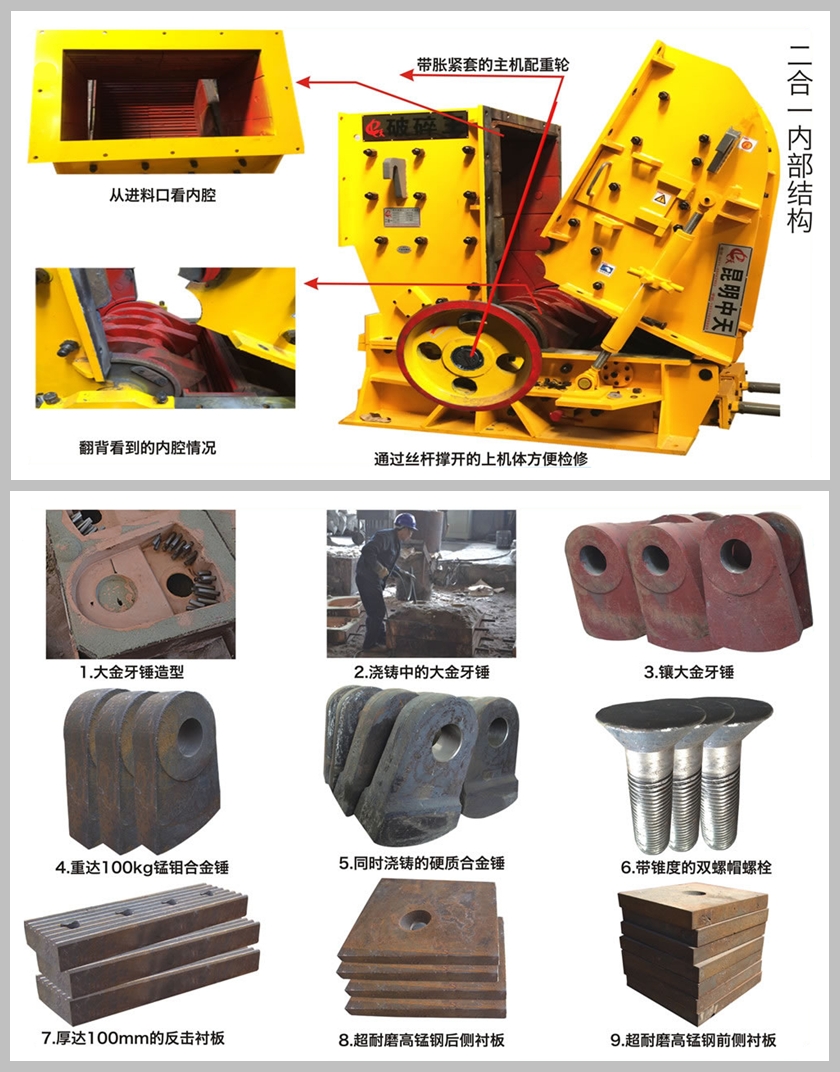 普通石料除錘頭和反擊襯板外,整個(gè)使用過(guò)程基本不用更換配件(沒(méi)有比二合一更省配件的破碎設(shè)備)。