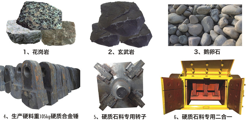 可破碎花崗巖、玄武巖、鵝卵石、鐵礦石等高硬度、磨損大的物料。破碎硬質(zhì)石料選用鑲大金牙錘或者同時(shí)澆鑄的硬質(zhì)合金錘,也可選用反擊式板錘。
